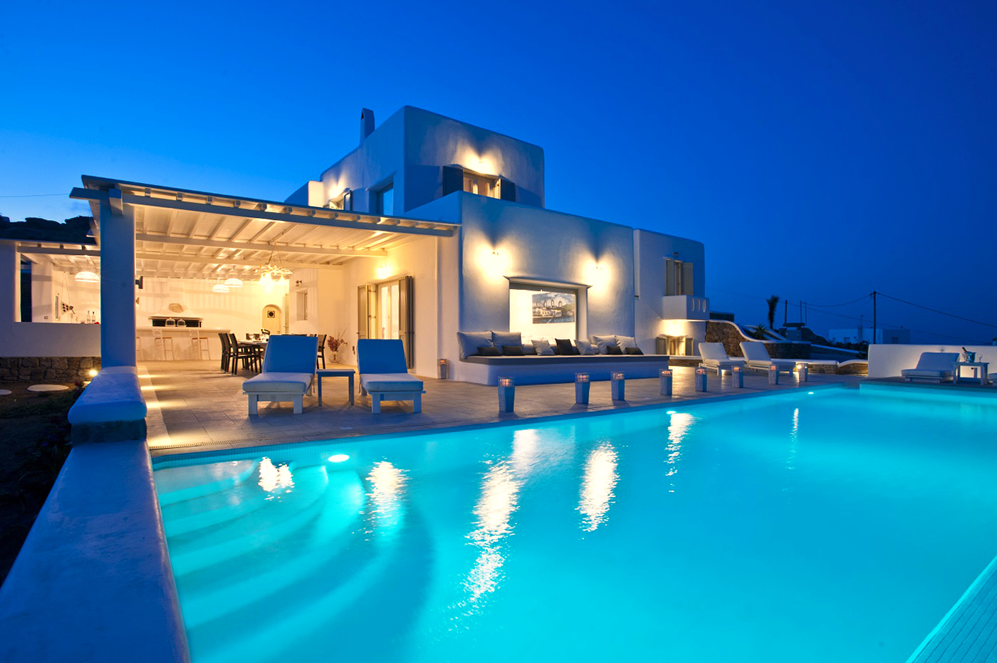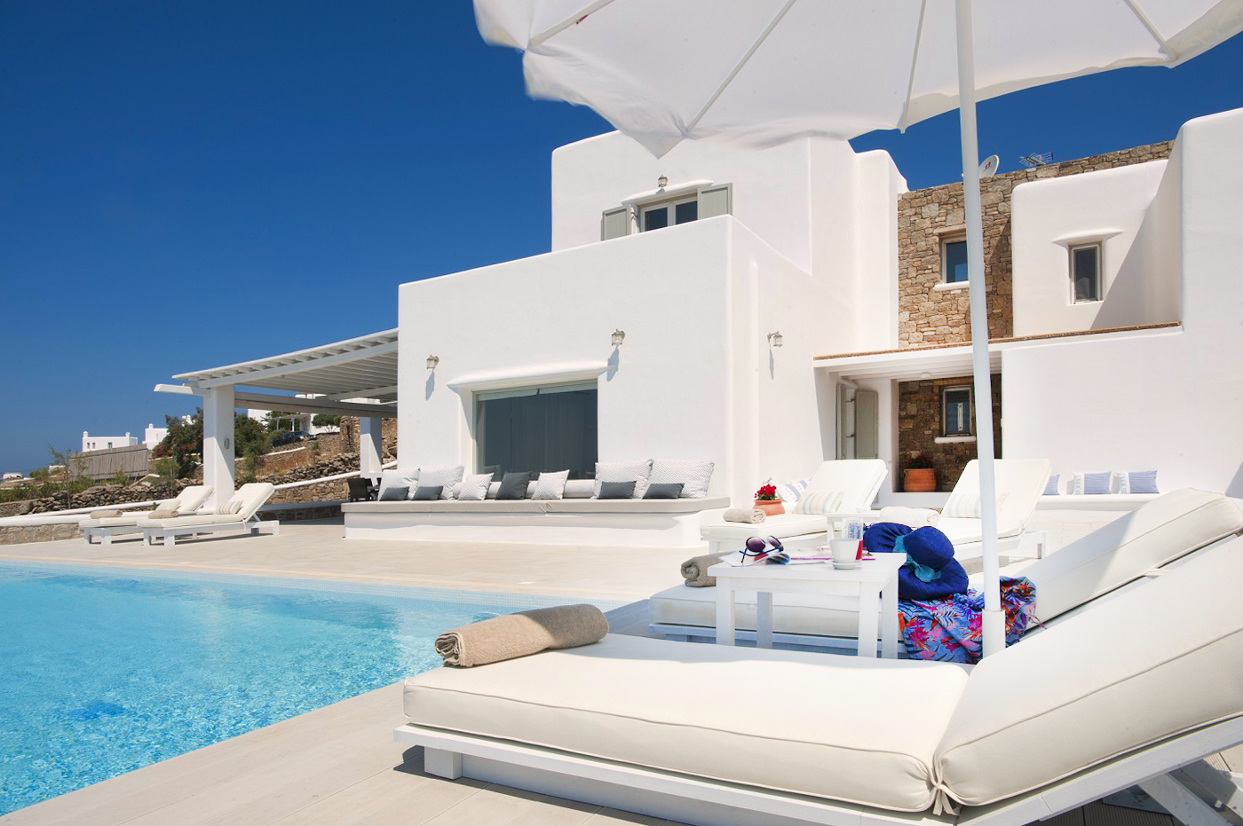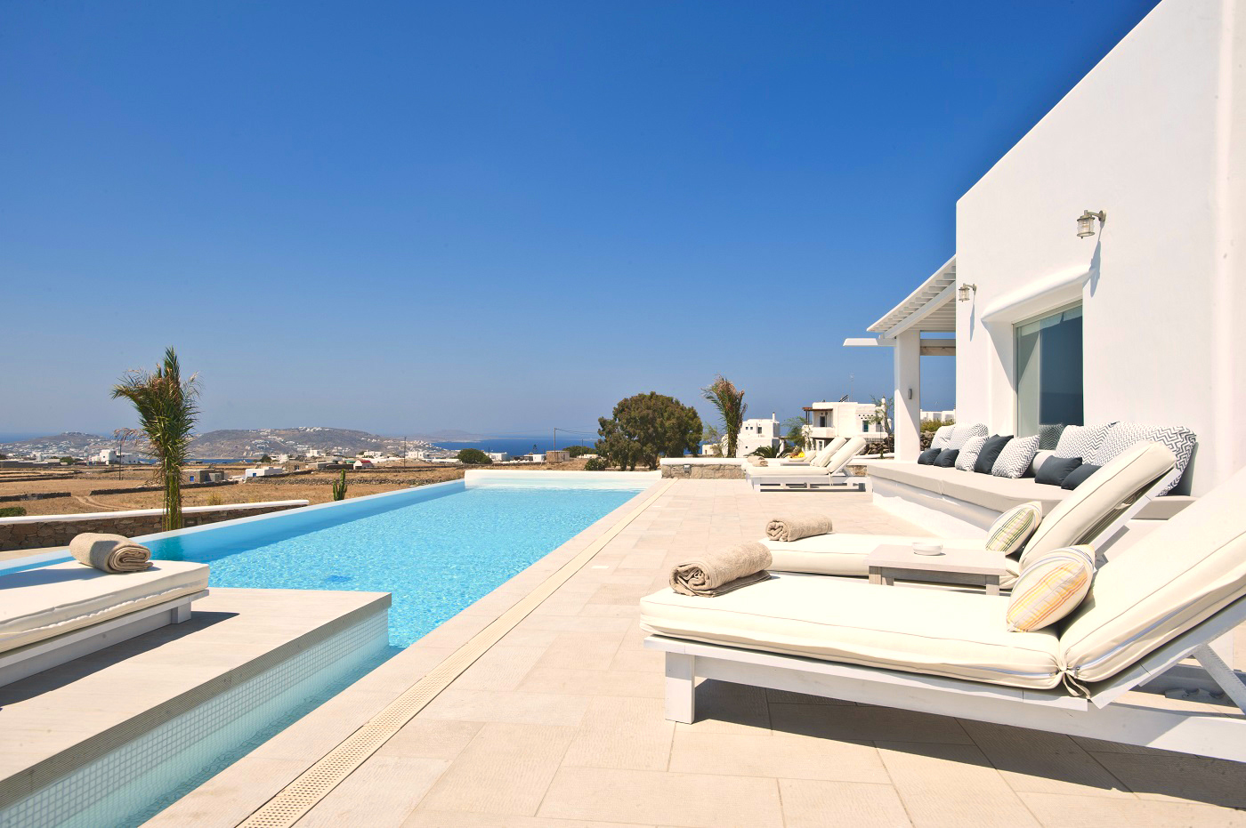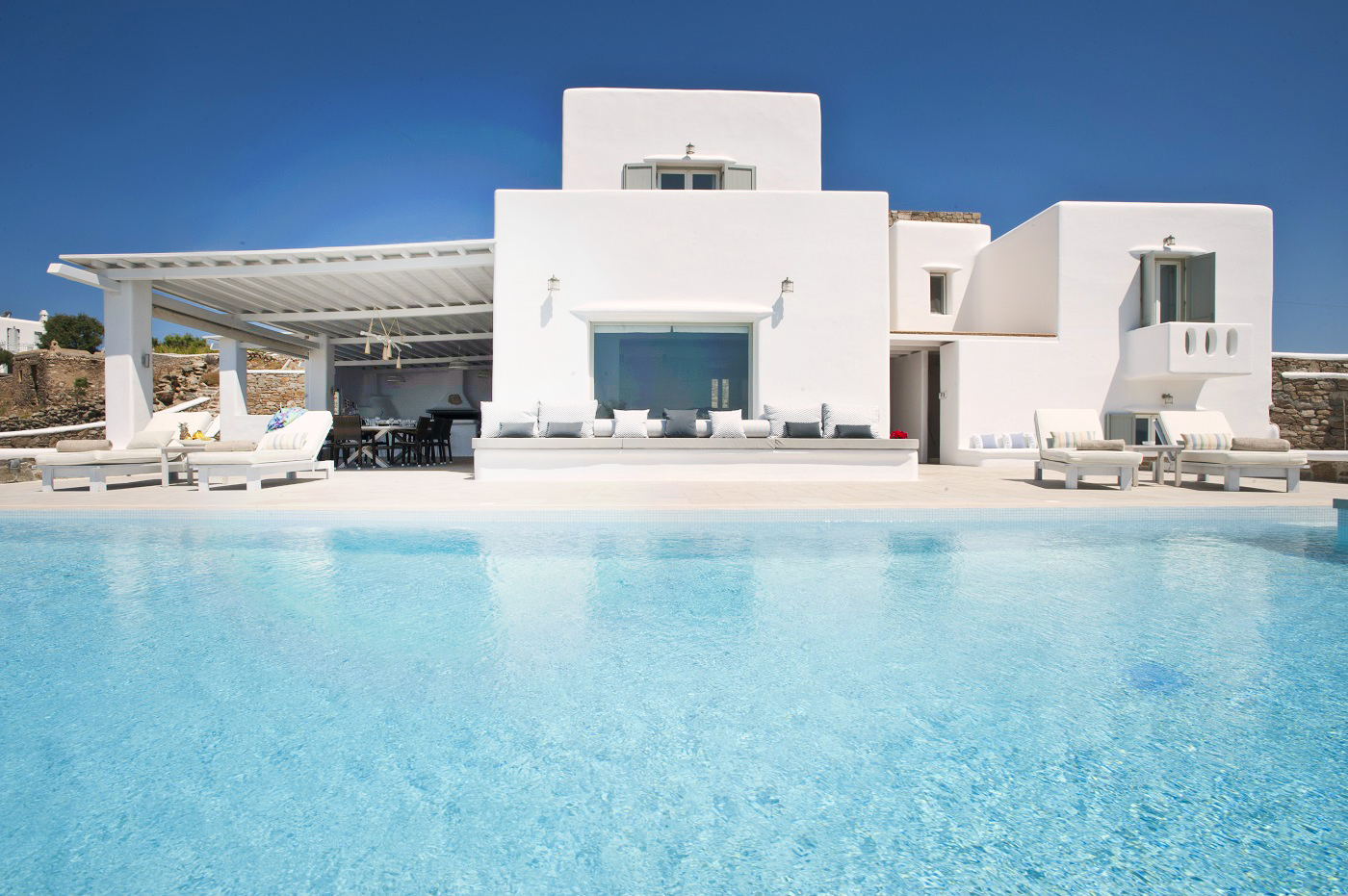 The impressive, private infinity swimming pool and a sitting lounge provides you with another relaxing place.. The property offers you extreme privacy which combines traditional Mykonian architecture with the luxury of modern conveniences, minimalistic style and comfort. It has 4 luxury bedrooms (one of its rooms is master ensuite bedroom) and 4 bathrooms. It also offers a fully equipped kitchen, dining room and a large living room.