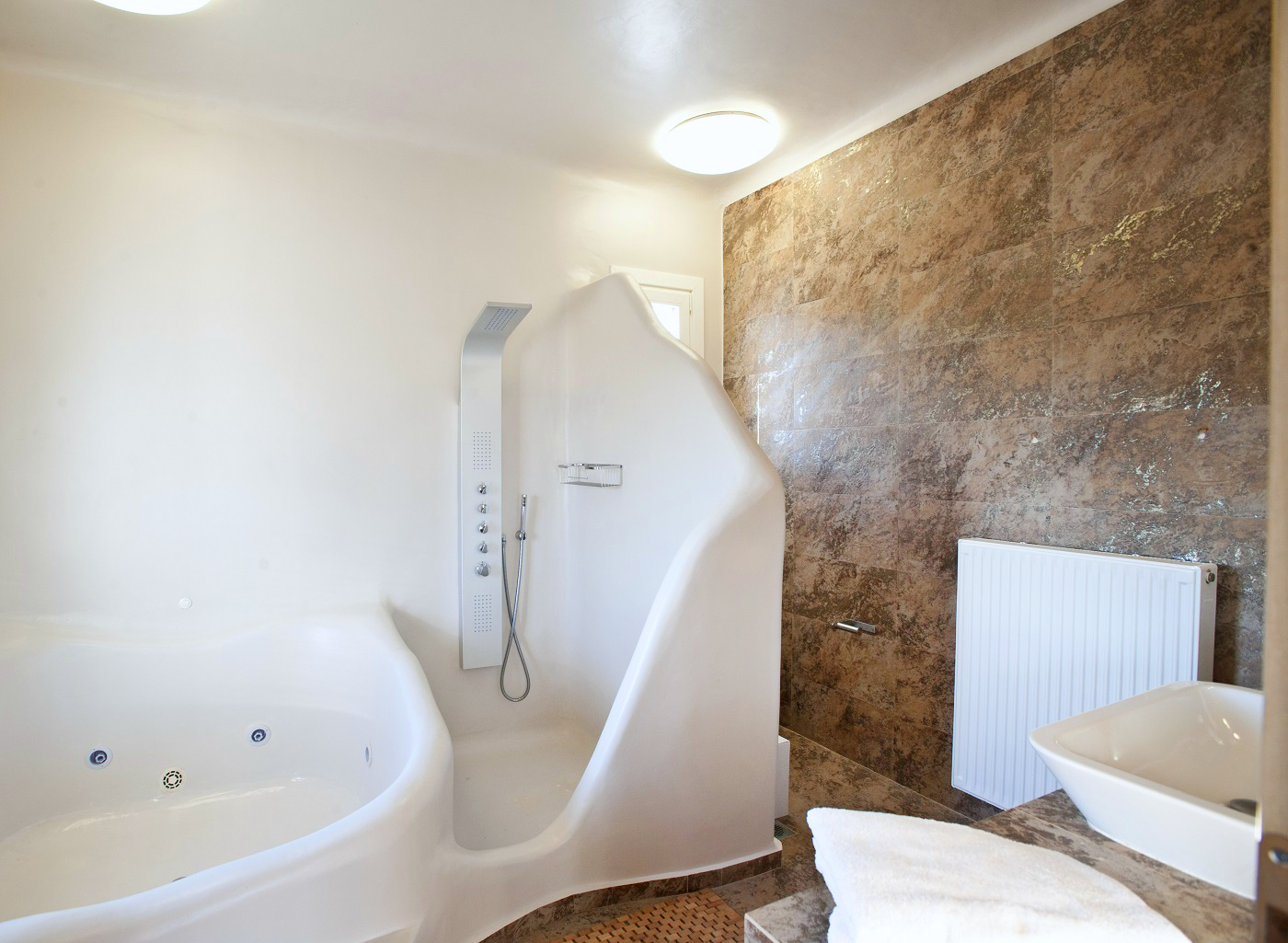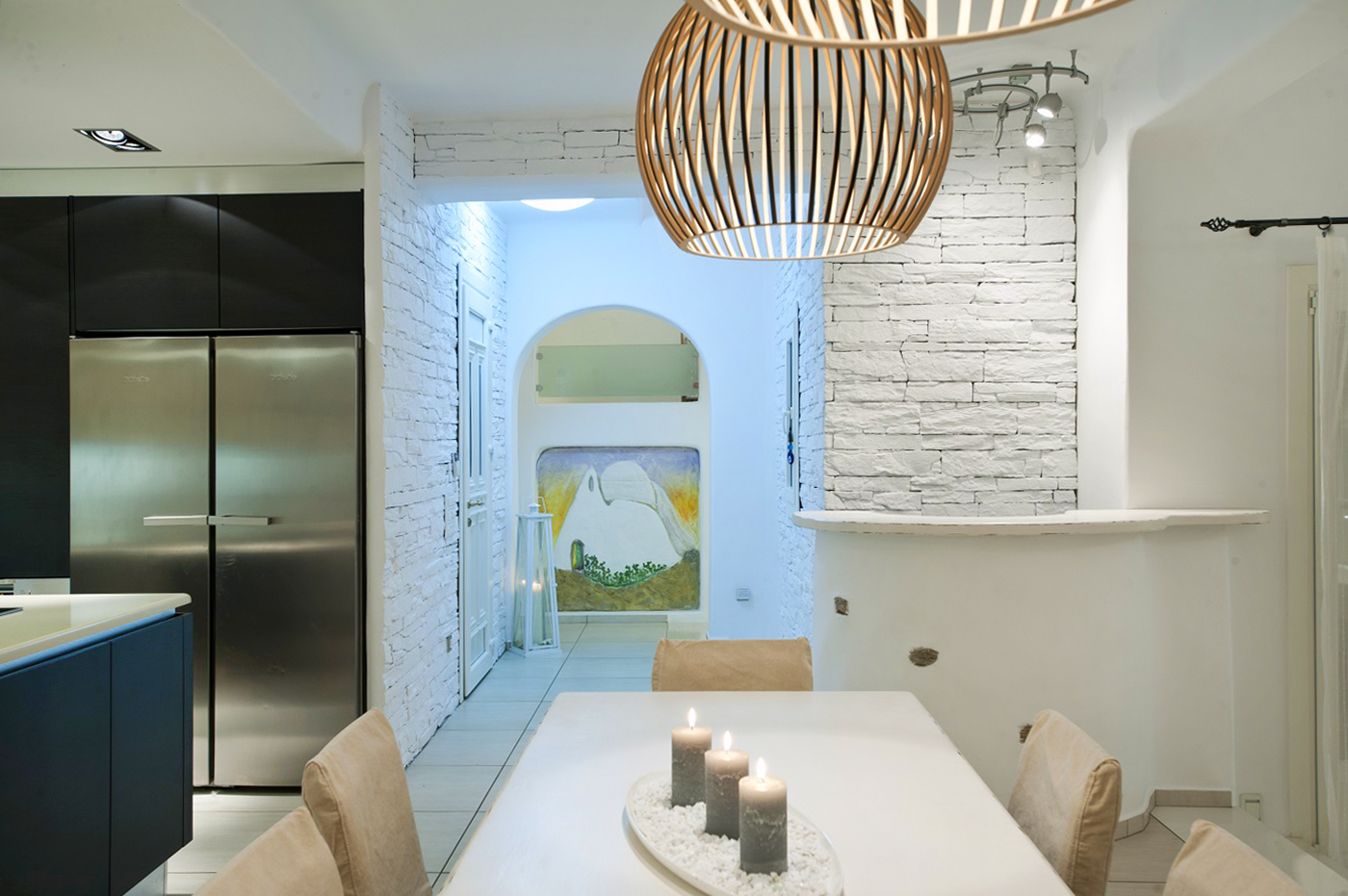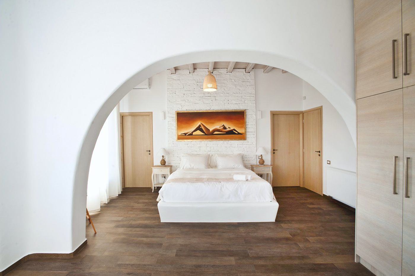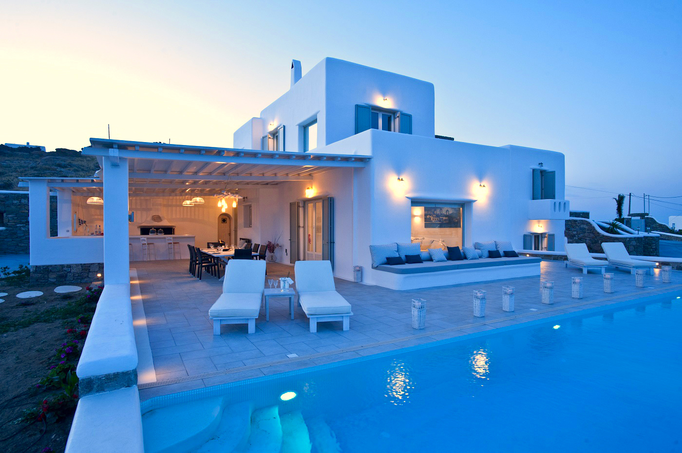 The impressive, private infinity swimming pool and a sitting lounge provides you with another relaxing place.. The property offers you extreme privacy which combines traditional Mykonian architecture with the luxury of modern conveniences, minimalistic style and comfort. It has 4 luxury bedrooms (one of its rooms is master ensuite bedroom) and 4 bathrooms. It also offers a fully equipped kitchen, dining room and a large living room.