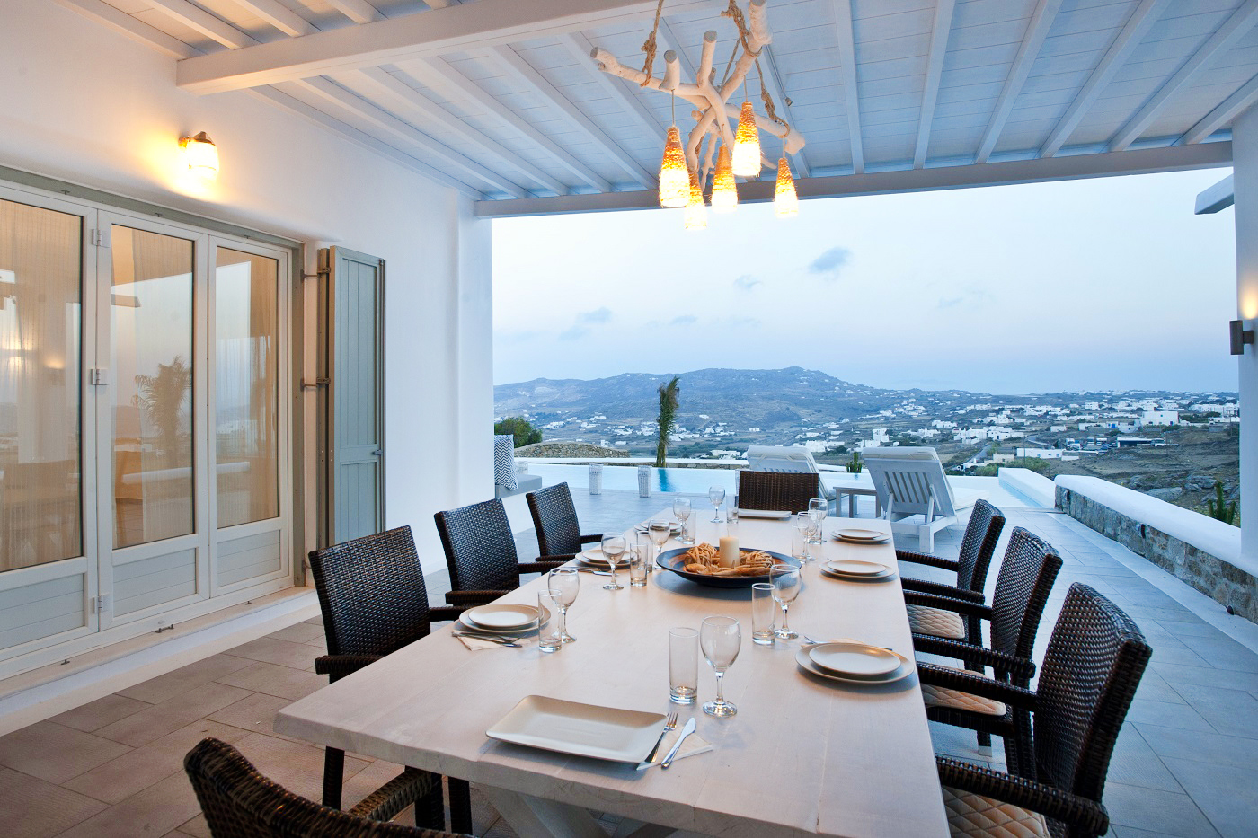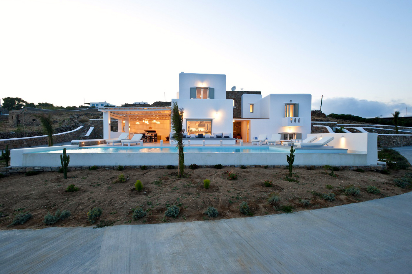 The villa is a newly built property located in Agia Paraskevi area, which is less than a 10 minute drive from the island’s town and just a 5 minute drive from the nearest beach . It has breathtaking views of the sunset, the Aegean sea and Delos island.