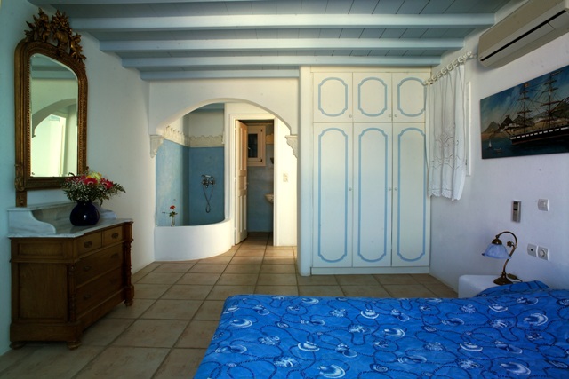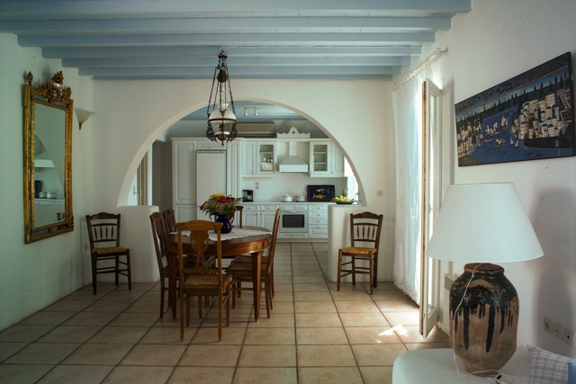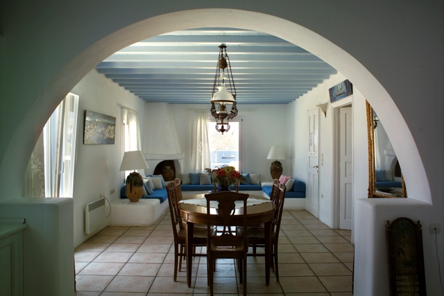 Luxury villa Katafygi built in traditional white Cycladic style for which Mykonos is so famous: offers comforts and style: air-conditioning in all bedrooms, antiques and local arts. House is reached by steps from road below, is built on 2 floors with large living room, nicely furnished with built-in sofas with cushions, fireplace corner, (color satellite cable (nova) TV , stereo & CD player, ADSL internet connection. telephone for incoming calls ) dining area and open plan fully-equipped kitchen, with fridge/freezer, dishwasher, washing machine & ironing board.