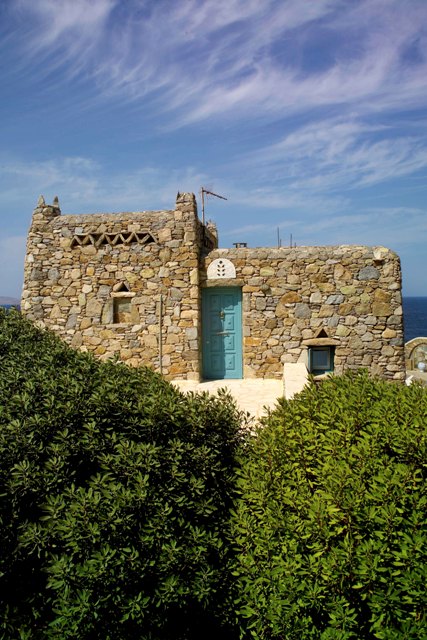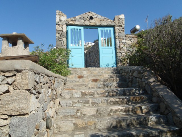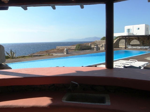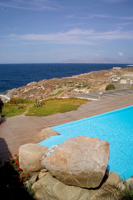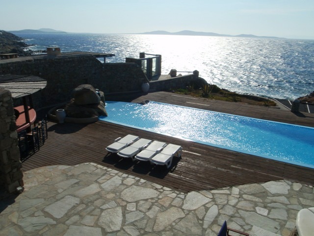 Location, Position & Distances: Right on coast in an exclusive residential area with many villa; overlooks sea facing west to wonderful sunsets and Delos views. Very quiet & peaceful location (even in peak season), right on waterfront: steps lead down to sea level rocks.