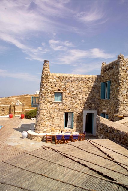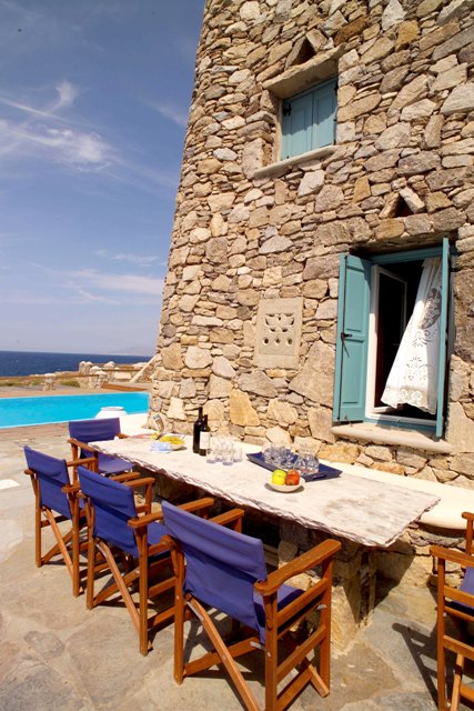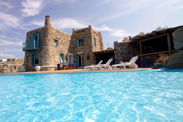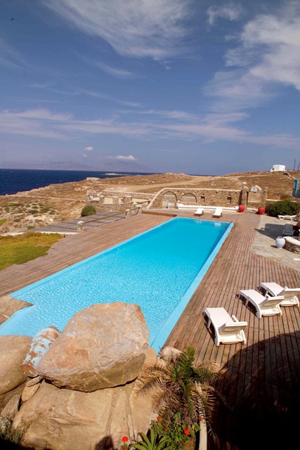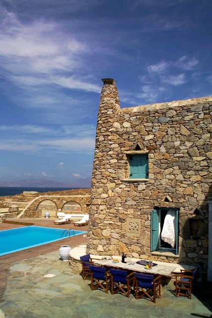 Impressive 250m2 villa Kehriniotissa on the sea built in natural stone and traditional style combines all modern comforts (air-conditioning) with traditional décor of the Greek islands. Large fabulous walk in swimming pool with sea water-pool boy measuring 6 x 14 meters (surrounded by hardwood deck & sun beds) is situated at front of villa and overlooks the Aegean sea till Delos.