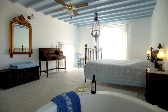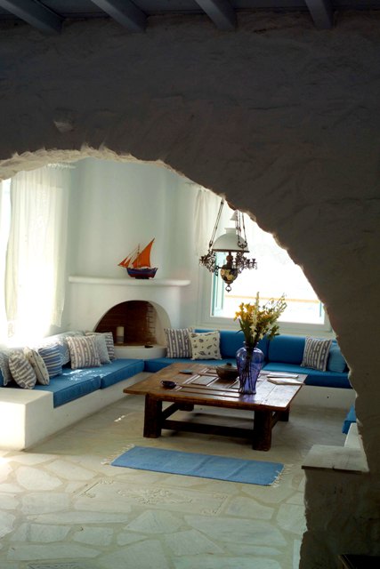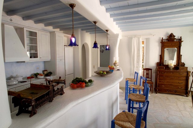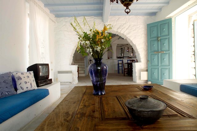 Interiors: House built on 2 floors with large nicely furnished living room with Cycladic style built-in sofas, open fire place, satellite cable (nova) colour TV, stereo music & CD player, ADSL internet connection; connects with large dining area. Plenty of wonderful details as lovely mirrors & lighting, carved marble..
