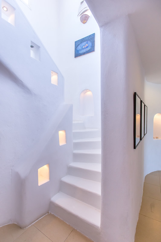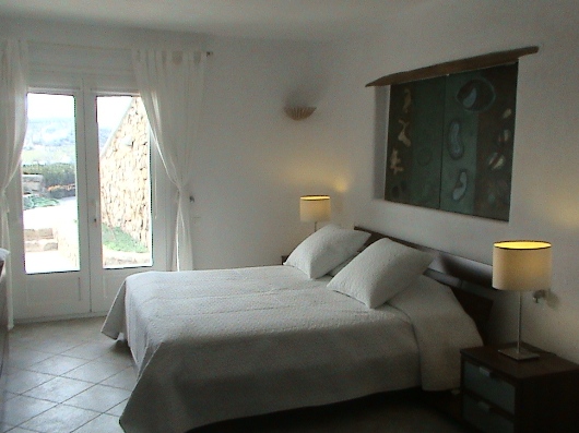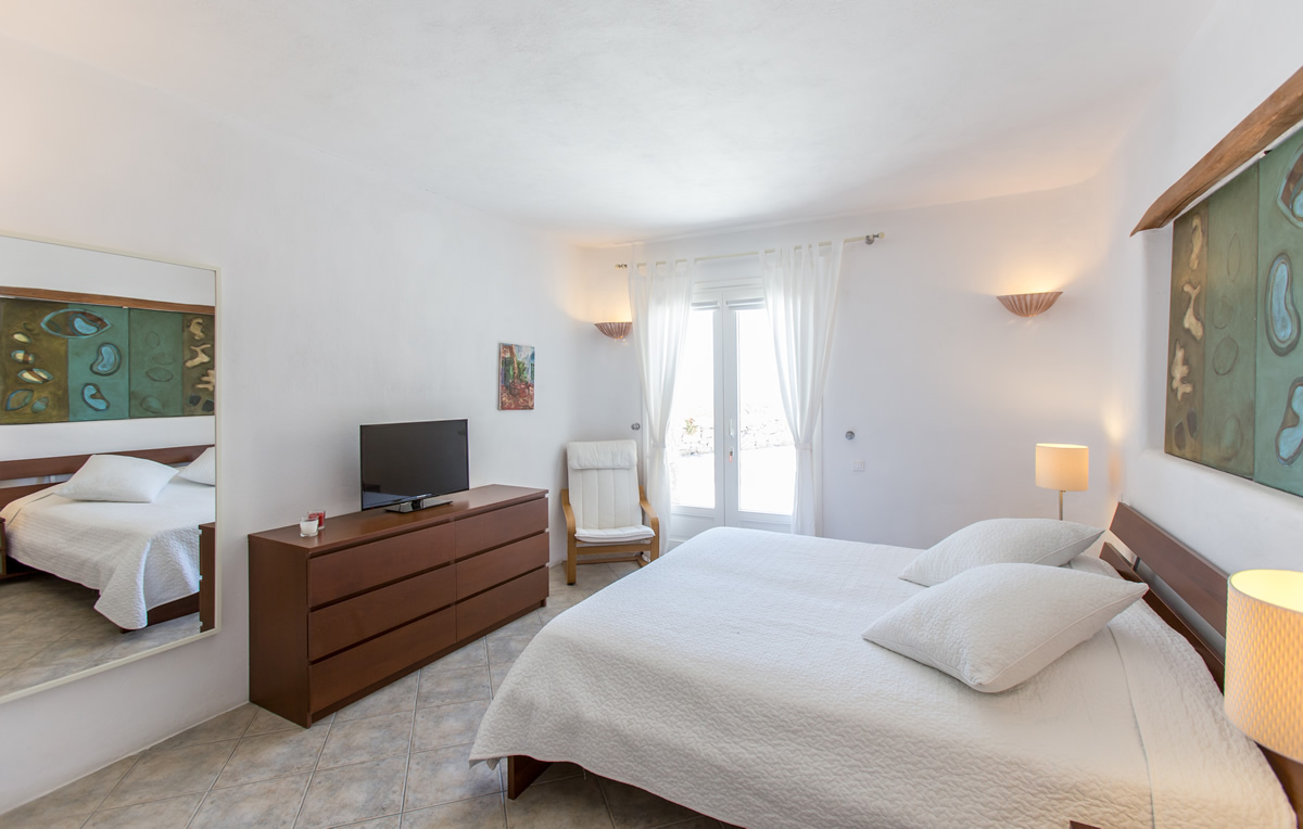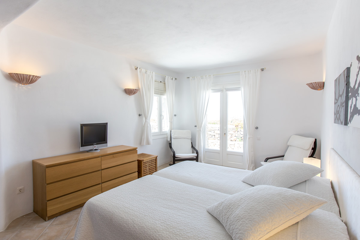 A fully equipped kitchen along with the main dining room and the living room are on the upper level, and have a view of the infinity blue. One level down lie the five bedrooms, each of which has two twin beds or a double bed, en-suite bathroom, as well as direct access to the terrace.
